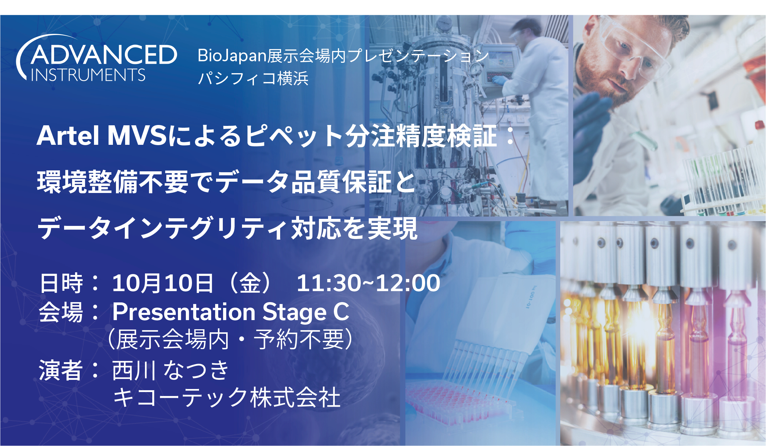 アドバンスド インストルメンツ(Advanced Instruments)社が2025年10月8日(水)~10日(金)にパシフィコ横浜にて開催されるBioJapan 2025にブース出展いたします。また、10月10日(金)にはマルチチャンネル分注量検証システム Artel MVSをご紹介する企業プレゼンテーションを行います。本展示会にお越しの際は是非お立ち寄りください。